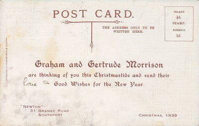 This 61st card was apparently privately commissioned by the Morrison family and was used as a Christmas greeting postcard (dated Christmas 1939) as well as an ordinary postcard (see the two backs below). It is interesting to note the two different spellings of the surname. |